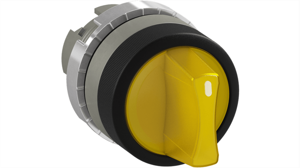 Pulsante a fungo giallo, attuatore con impugnatura corta, funzione mantenuta/momentanea, grado di protezione IP66 sul lato anteriore, forma rotonda con manopola, serie 1SFA1, codice costruttore 1SFA184613R9103, marchio ABB.