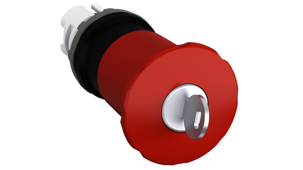 Pulsante di arresto di emergenza non illuminato, montaggio a pannello, diametro foro 22 mm, attuazione a pulsante, rilascio a chiave, materiale in policarbonato, parte della gamma modulare ABB di dispositivi pilota. Codice costruttore 1SFA611525R1101. Dimensioni testa 30 mm e 40 mm.