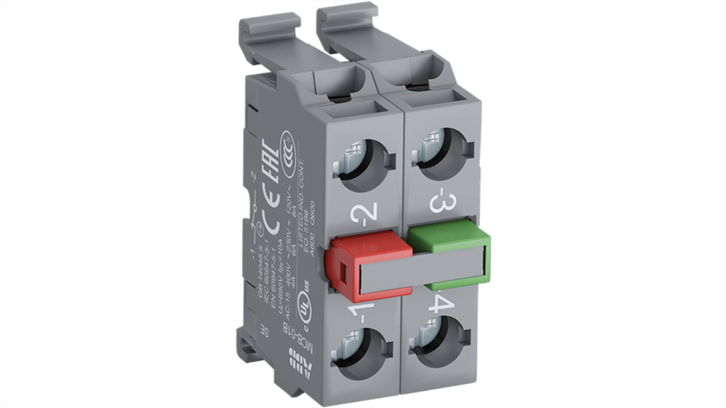 Blocco contatti modulare ABB, tensione nominale 690V, configurazione 1 N/A + 1 N/C, tipo terminale a vite, non illuminato. Compatibile con MP1, MP2, MP3, MP4 e MPD. Serie MCB. Codice costruttore 1SFA611610R2011 MCB-11B.