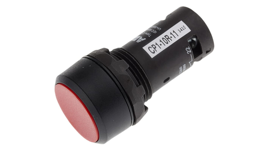 Pulsante momentaneo ABB, SPDT, tensione nominale 300 V, montaggio a pannello, diametro foratura 22 mm, grado di protezione IP69K, gamma di temperatura operativa -25 a +70 gradi Celsius, corpo in plastica, materiale pulsante in policarbonato, peso 22 g, dimensioni 55 x 30 x 30 mm, colore rosso, terminali a vite. Codice produttore 1SFA619100R1071 CP1-10R-11.