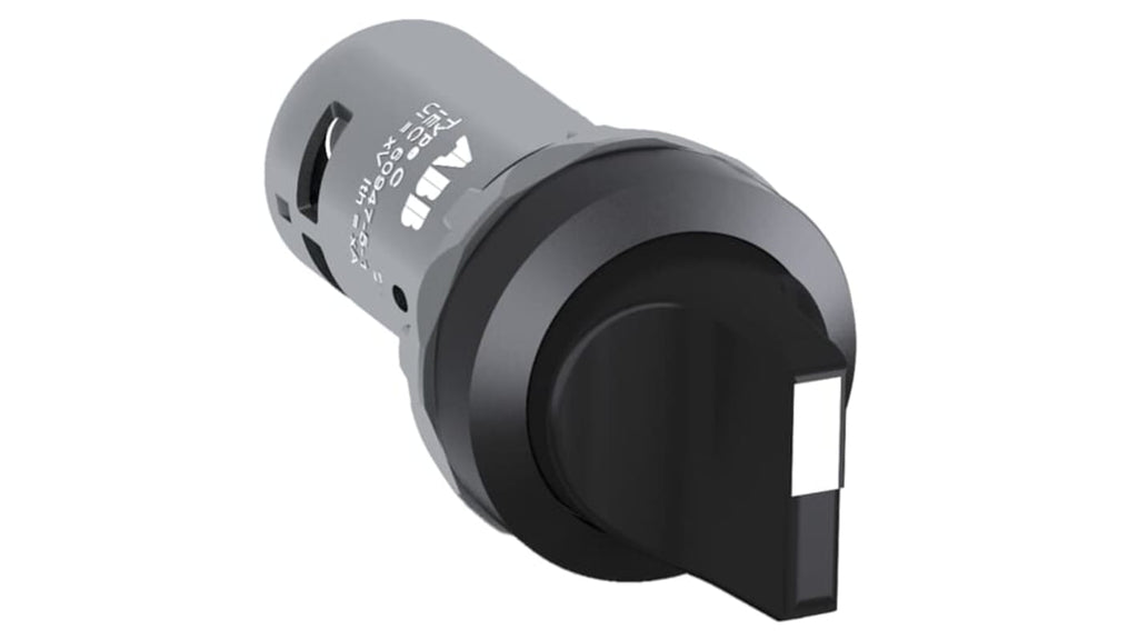 Selettore a 2 posizioni ABB, modello C2SS2-10B-11, realizzato in plastica nera, impugnatura corta, non illuminato. Configurazione contatto: 1 N/A + 1 N/C. Grado di protezione IP66, corrente massima 1A. Prodotto compatto, adatto per applicazioni industriali.