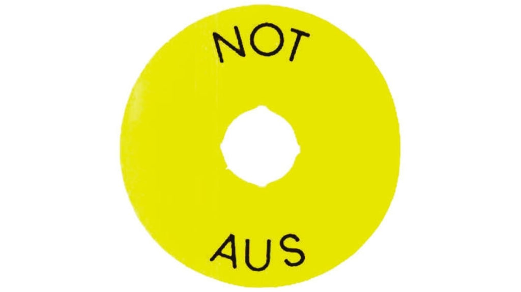 Etichetta di arresto di emergenza, materiale alluminio, colore giallo con iscrizione nera. Gamma compatta 22,5 mm, progettata per soluzioni economiche e affidabili. Codice costruttore 1SFA619930R1027 - CA6-1027, marchio ABB. Specifiche tecniche: accessori, etichetta, testo etichetta, Not - Aus.