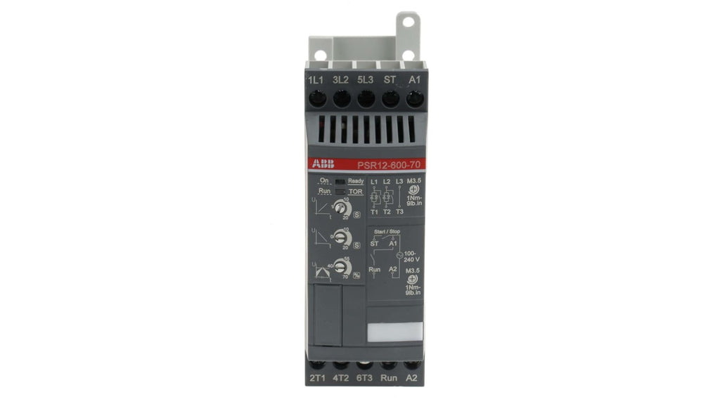 Soft starter ABB, 3 fasi, potenza nominale 5,5 kW, tensione nominale 600 V c.a., corrente nominale 12 A, grado di protezione IP20, dimensioni 45 mm x 114 mm x 140 mm, temperatura d'esercizio -25 °C a +70 °C, bypass incorporato, compatibile con motori da 3 a 45 A, standard soddisfatti CCC, CE, CSA, UL. Codice costruttore 1SFA896106R7000.