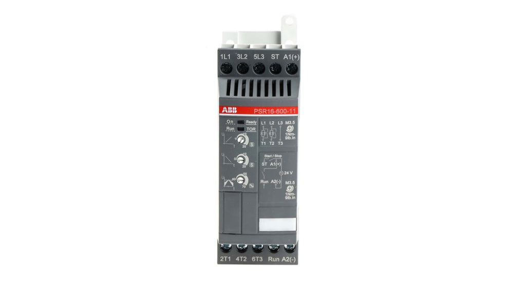 Avviatore soft-start trifase, potenza nominale 7,5 kW, tensione 208 a 600 V c.a., corrente nominale 16 A, grado di protezione IP20. Dimensioni 45 mm x 114 mm x 140 mm, serie PSR. Morsetti a vite per collegamento sicuro, gestisce fino a 10 avviamenti all'ora, operante in un range di temperatura da -25 a +60 gradi Celsius.