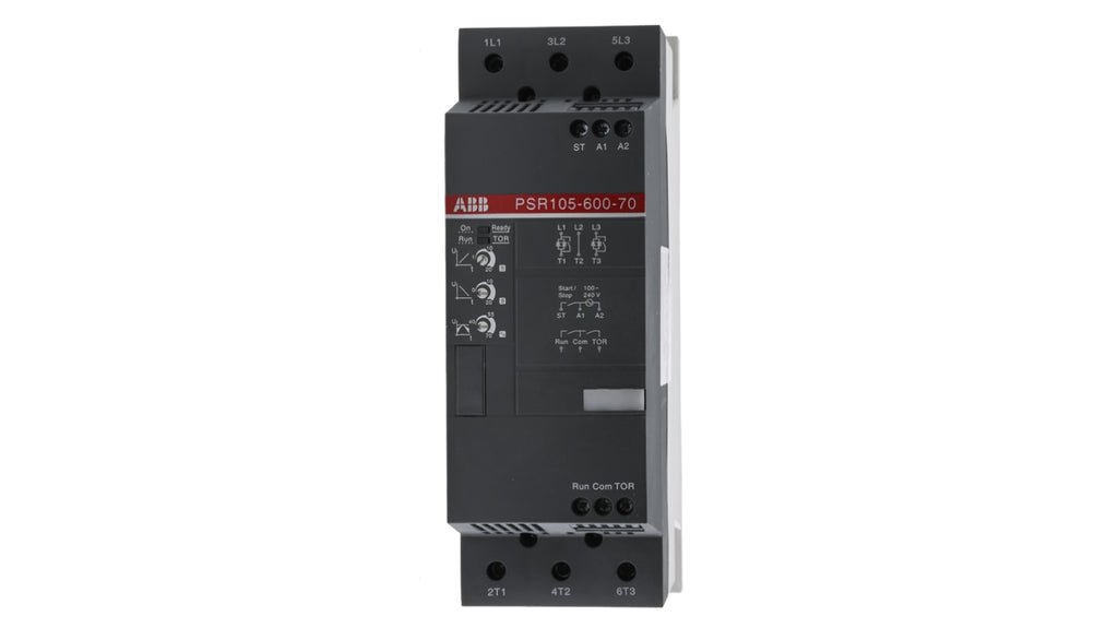 Soft starter manuale ABB, potenza nominale 55 kW, corrente nominale 105 A, tensione 600 V c.a., 3 fasi, grado di protezione IP10 e IP20, montaggio a vite o su guida DIN, indicatori LED, 3 potenziometri per impostazione manuale, intervallo di temperatura da -25 a +60 gradi, fino a 100 avviamenti all'ora, conforme a CCC, CE, CSA, UL. Dimensioni: 180 mm x 70 mm x 220 mm. Codice costruttore 1SFA896115R7000.