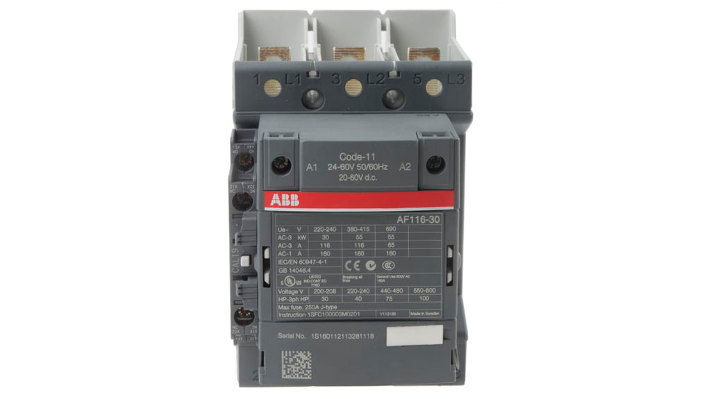 Contattore ABB, serie AF, 3 poli, 3 NA, 160 A, 55 kW, bobina 24 V ca/cc, tensione nominale contatto 690 V c.a., corrente nominale 160 A, potenza nominale 55 kW, configurazione stato normale 3 NA, 2 contatti ausiliari, terminazione ad anello ad aletta, dimensioni 150 mm x 90 mm x 126 mm, temperatura operativa da -40 a +70 gradi, conforme a IEC 60947-1/60947-4-7 e EN 60947-1/60947-4-1.
