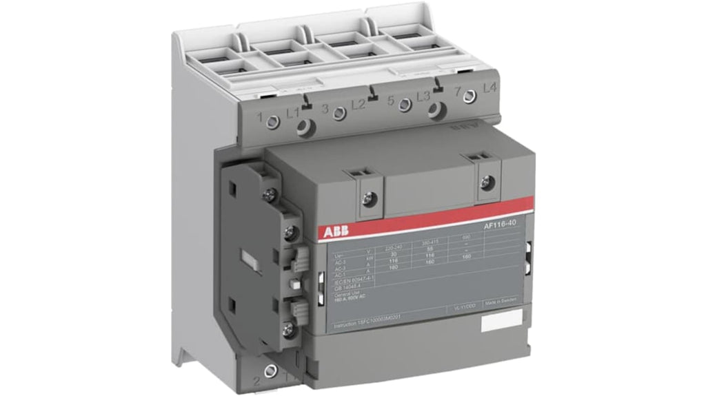 Contattore ABB, serie AF, 4 poli, 4 NA, 160 A, 55 kW, bobina 250 V. Tensione bobina 250 V, corrente nominale 160 A, potenza nominale 55 kW, design a blocco, protezione contro le sovratensioni incorporata, configurazione con 1 contatto ausiliario. Gestisce ampie variazioni di tensione di controllo, riducendo i consumi energetici in reti instabili. Codice costruttore 1SFL427101R1311 AF116-40-11-13 100-250V.