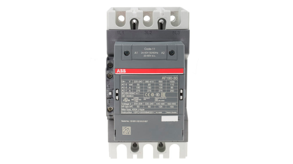 Contattore ABB, serie AF, 3 poli, 3 NA, 275 A, 90 kW, bobina 24 V ca/cc. Tensione nominale contatto 690 V c.a., corrente nominale 275 A, configurazione 3P, dimensioni 196 mm x 105 mm x 152 mm, temperatura operativa -40°C a +70°C, conforme a IEC 60947-1/60947-4-7 e EN 60947-1/60947-4-1. Tipo terminale a terminazione ad anello ad aletta, 2 contatti ausiliari.