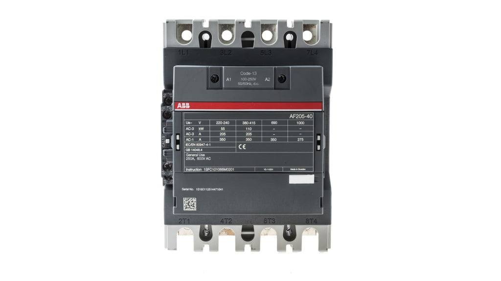 Contattore ABB, serie AF, 4 poli, 4NO, potenza nominale 110 kW, corrente nominale 350 A, tensione bobina 230 V ca, grado di protezione IP20, peso netto 3,3 kg, dimensioni 195,6 mm x 140 mm x 152,6 mm, temperatura operativa da -40 a +70 gradi Celsius, montaggio a pannello o su guida DIN, tipo terminale a vite, configurazione contatti ausiliari 1NC. Codice costruttore 1SFL527102R1311.