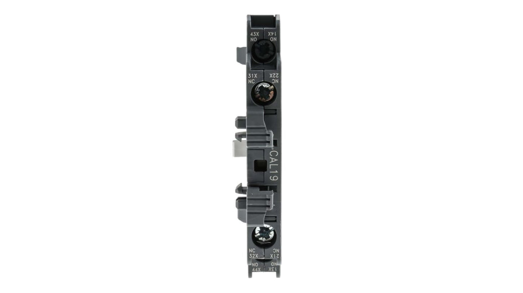 Contatto ausiliario ABB, 4 contatti, 2NC + 2NO, montaggio laterale, serie CAL19. Corrente nominale contatto 6 A, tensione nominale 690 V c.a., dissipazione di potenza 0,15 W, tipo terminale a vite. Dimensioni 67,3 x 79 x 14,9 mm, durata meccanica 5 milioni di cicli. Elevata protezione contro sovratensioni transitorie, tensione di resistenza agli impulsi 6 kV.