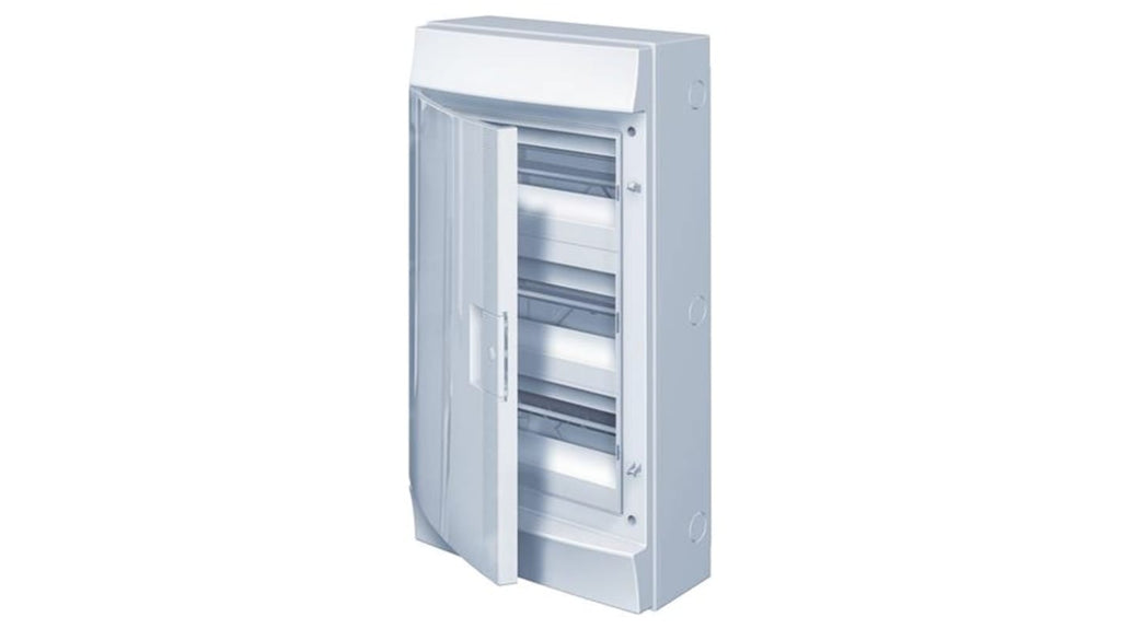 Unità di protezione MISTRAL65, 36 vie, 125A, custodia in plastica, grado di protezione IP65, dimensioni 435 x 320 x 155mm, porta trasparente blu petrolio con apertura a 180°, design simmetrico per reversibilità, telaio estraibile per cablaggio facilitato, compatibile con morsettiere dedicate, installazione rapida di MCB e MCCB ABB, tappi di chiusura a innesto per protezione di classe II.