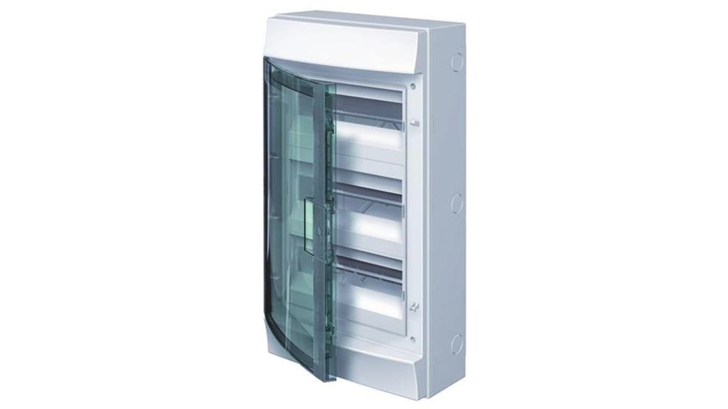 Unità di consumo ABB, 36 vie, corrente nominale 125 A, grado di protezione IP65, custodia in plastica, dimensioni 435 x 320 x 155 mm, sportello trasparente, serie Mistral65, compatibile con MCB e MCCB ABB, scorrimento interno per fissaggio a parete invisibile, pannello frontale girevole.