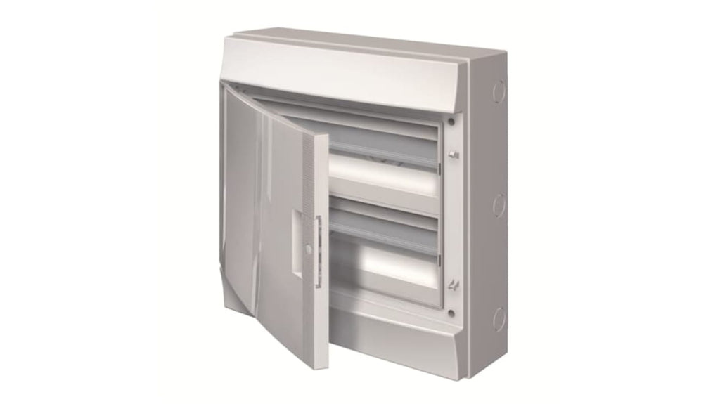 Unità per utenze civili, montaggio in superficie, grado di protezione IP65, custodia in plastica, porta in plastica opaca, dimensioni 435 mm x 430 mm x 155 mm, classe di protezione isolata (classe II), codice costruttore 1SLM006500A2115, marchio ABB.
