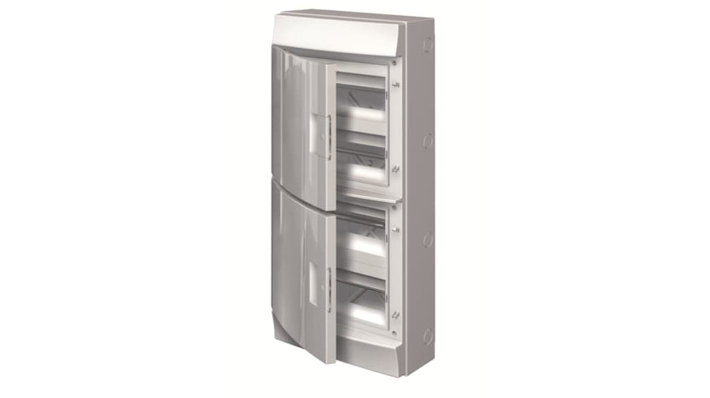 Unità per utenze civili, montaggio in superficie, grado di protezione IP65, custodia in plastica, porta in plastica opaca, dimensioni 735 mm x 320 mm x 155 mm, classe di protezione isolata (classe II), codice costruttore 1SLM006500A2117, marchio ABB.