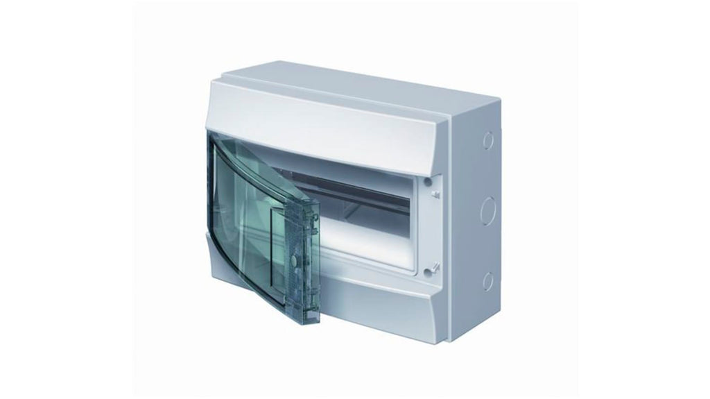 Unità di consumo ABB, corrente nominale 63 A, contenitore in plastica, grado di protezione IP65, 12 vie di uscita, dimensioni 320 x 155 x 250 mm, compatibile con guida DIN per dispositivi di corrente residua, sportello trasparente per accesso rapido agli interruttori. Serie Mistral65. Colore bianco.