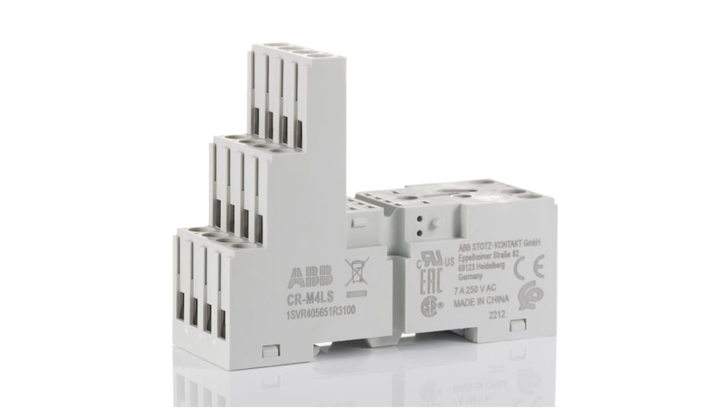 Zoccolo per relè ABB, quattro poli, serie CR-M, terminazione a vite, montaggio su circuito stampato. Dimensioni 61 x 27 x 82 mm, alloggiamento in poliammide rinforzato con fibra di vetro, temperatura operativa da -40 a +70 gradi Celsius. Contatti in lega di rame per elevata conducibilità elettrica. Applicabile in stazioni elettriche, ingegneria marina e imballaggio. Codice costruttore 1SVR405651R3100 CR-M4LS.