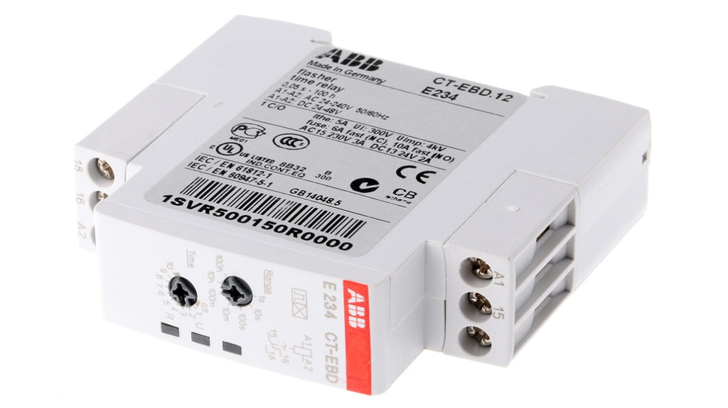 Timer relay per guida DIN, intervallo di temporizzazione da 0.05 s a 100 h, contatti SPDT, tensione di alimentazione 24-240 V AC, 24-48 V DC, corrente nominale 8 A a 250 V AC, materiale contatti AgSnO2, temperatura operativa da -20 a +60 gradi Celsius, LED per indicazione di stato, conforme a IEC/EN 61812-1, UL, GL, GOST, c-Tick, dimensioni 17.5 mm x 58 mm x 70 mm.