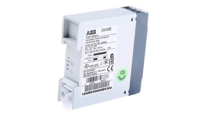 Relè di monitoraggio temperatura SPST ABB, codice 1SVR550800R9300 CM-MSE, tensione di resistenza agli impulsi 4 kV, frequenza alimentazione 50/60 Hz, intervallo temperatura operativa -20 a +60 gradi, montaggio su guida DIN, dimensioni 78.5 x 22.5 x 78 mm, peso 110 g, grado di protezione IP50, standard CCC, CE, CSA, EAC, UL, gamma di corrente 2 a 4 A.