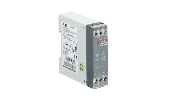 Relè di monitoraggio ABB, serie CM-PVE, SPST, gamma di misurazione tensione 185-265 V CA e 320-460 V CA, ritardo 500 ms, montaggio su guida DIN, dimensioni 78.5 x 22.5 x 78 mm, temperatura operativa -20 a +60 gradi Celsius, grado di protezione IP20, indicatore LED giallo, lunga durata fino a 30 milioni di cicli meccanici.