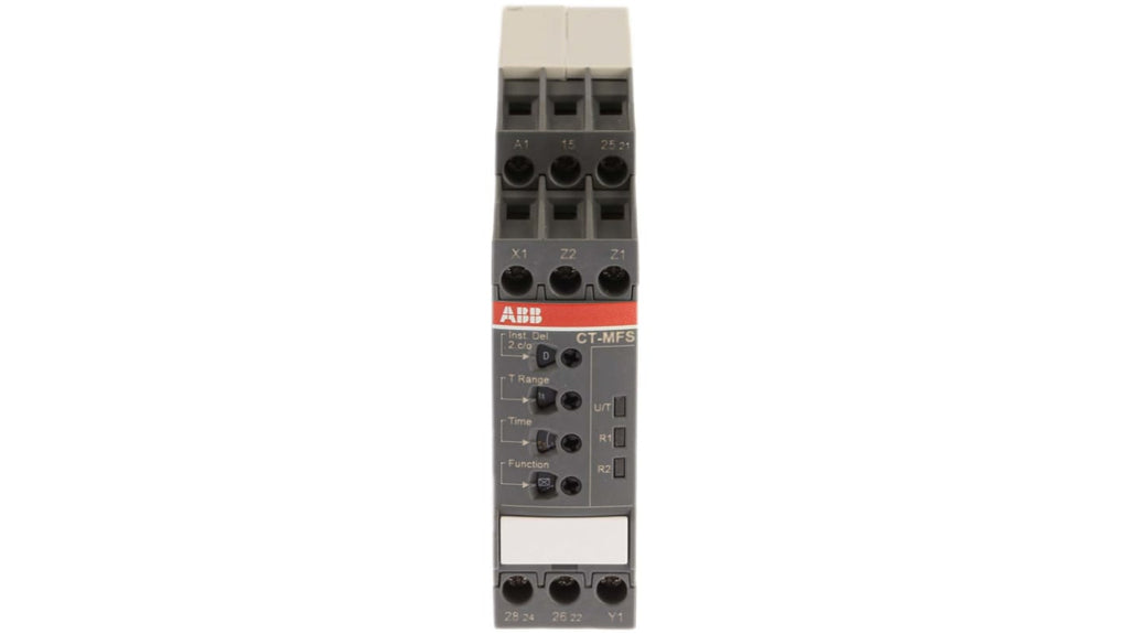Relè timer ABB multifunzionale, 10 funzioni di temporizzazione, 10 intervalli di tempo da 0,05 secondi a 300 ore, tensione di alimentazione 24VAC/DC a 240VAC/DC, attivazione senza tensione, contenitore ignifugo, regolazione tramite comandi frontali, collegamento a vite o Easy Connect, montaggio su guida DIN, due contatti SPDT, larghezza 22,5 mm, certificazioni CE, UL 508, GOST, approvazione GL.