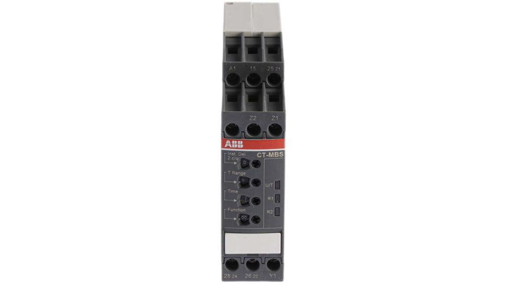 Relè timer ABB, tensione di alimentazione di controllo 24-48 V CC, gamma di tempo 0,05 s - 300 h, serie CT-MBS.22S, codice 1SVR730010R3200. Dieci funzioni di temporizzazione, montaggio su guida DIN, terminali a vite, indicatori LED per stato di funzionamento, intervallo di temperatura -25°C a +60°C. Adatto per lavastoviglie, sistemi di controllo dei processi, automazione industriale.