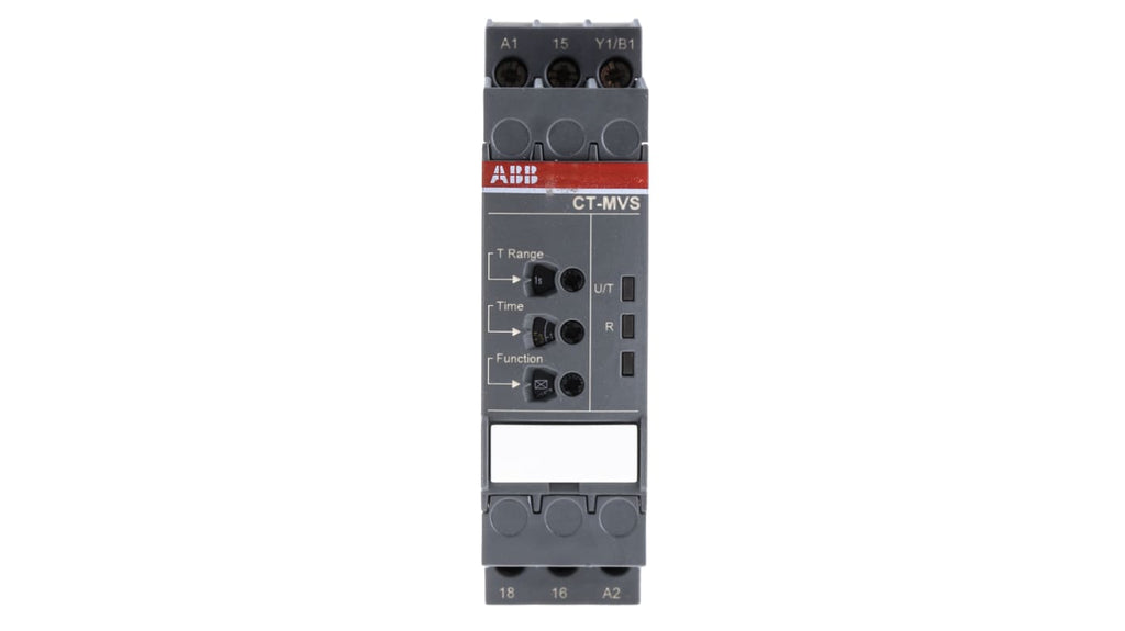 Relè temporizzato multifunzione della serie CT-MVS, 5, 10 o 11 funzioni di temporizzazione, 10 intervalli di tempo da 0,05 secondi a 300 ore, ingresso di comando a tensione, tecnologia di collegamento a vite o Easy Connect, montaggio su guida DIN senza utensili, 2 contatti C/O, larghezza 22,5 mm, profondità 113,4 mm, tensione di alimentazione 24 a 240 V AC, 24 a 48 V DC, contenitore con alta classe di protezione.