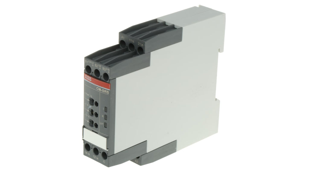 Relè di monitoraggio corrente, monofase CC/CA, serie CM-SRS, DPDT. Corrente minima rilevata 0,3 A, massima 15 A, con intervalli di misurazione 3 mA - 1 A e 0,3 - 15 A. Isteresi regolabile 3-30%, ritardo di attivazione 0,1-30 s. Dimensioni 103,7 x 22,5 x 85,6 mm, larghezza 22,5 mm, temperatura operativa -20 a +60 gradi. Montaggio su guida DIN, contatti a vite, 3 LED di stato.