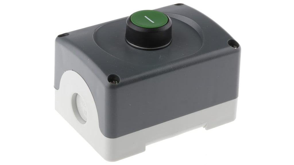Scatola con pulsante per stazioni di controllo ad avvio/arresto singolo, grado di protezione IP66, struttura robusta per uso interno ed esterno, conforme a IEC 60947-5-1 e IEC 60947-5-5, fornita con blocco di contatti e possibilità di montaggio di blocchi aggiuntivi, arresto di emergenza conforme a EN418, dimensioni 75mm x 101mm x 74mm, colore contenitore grigio, colore pulsante verde, materiale plastica, diametro foro 22mm.