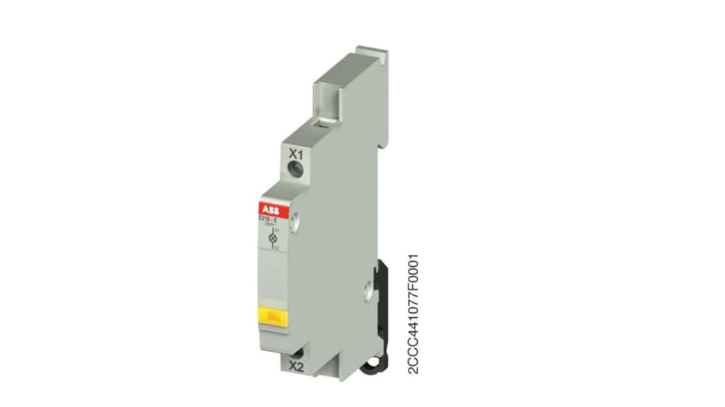 Indicatore LED montaggio a pannello, colore giallo, tensione nominale 48V, forma rettangolare, tecnologia LED per elevata durata, grado di protezione IP20, serie E219, codice costruttore 2CCA703423R0001 E219-E48 JAUNE, marchio ABB.
