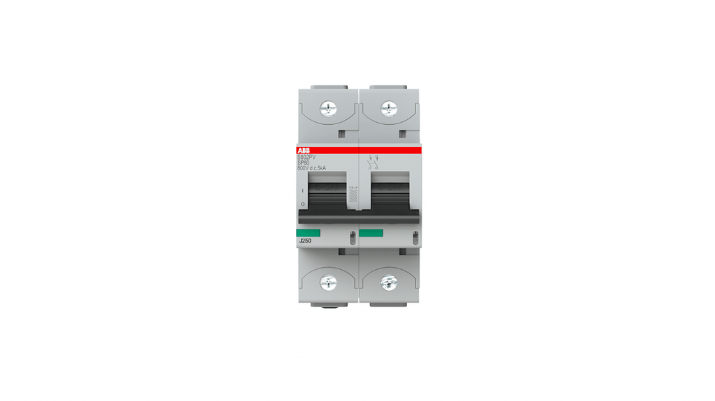 Interruttore magnetotermico a 2 poli, 80A, Tipo B, serie S800PV, montaggio su guida DIN, capacità di interruzione 5kA, tensione massima 800V c.c., meccanismo di scatto termico per sovraccarichi, meccanismo di scatto elettromeccanico per cortocircuiti, grado di protezione IP20, classe di limitazione dell'energia 3, temperatura operativa da -25 a 60 gradi. Marchio ABB.