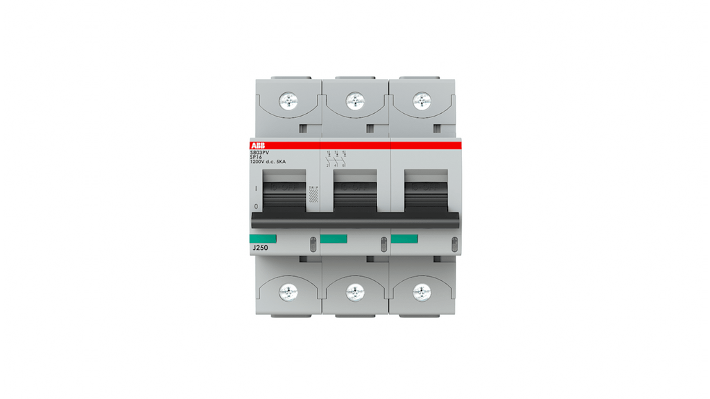 Interruttore magnetotermico a 3 poli, 16A, Tipo B, serie S800PV, capacità di interruzione 5kA, tensione fino a 1200V c.c., meccanismo di scatto termico e elettromeccanico, grado di protezione IP20, classe di limitazione dell'energia 3, temperatura ambiente da -25 a 60 gradi Celsius, montaggio su guida DIN. Codice costruttore 2CCF019612R0001 S803PV-SP16.