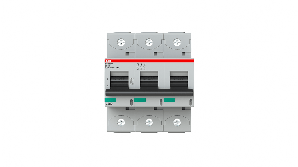 Interruttore magnetotermico a 3 poli, 40A, Tipo B, serie S800PV, montaggio su guida DIN, capacità di interruzione 5kA, tensione fino a 1200V c.c., meccanismo di scatto termico e elettromeccanico, grado di protezione IP20, classe di limitazione dell'energia 3, temperatura operativa da -25 a 60 gradi Celsius. Codice costruttore 2CCF019616R0001 S803PV-SP40.
