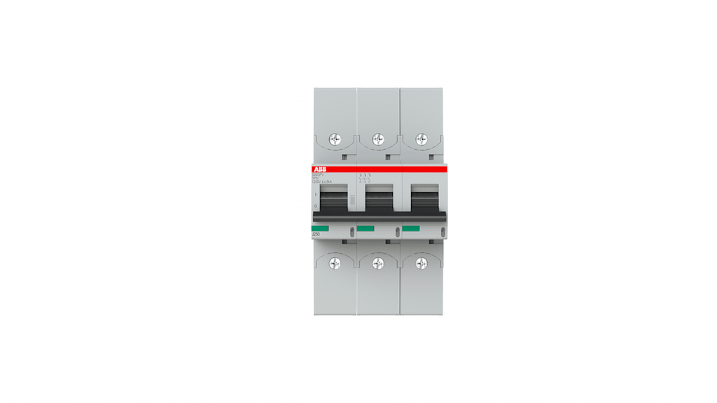 Interruttore magnetotermico a 3 poli, 80A, Tipo B, serie S800PV, capacità di interruzione 5kA, tensione fino a 1200V c.c., meccanismo di scatto termico e elettromeccanico, grado di protezione IP20, classe di limitazione dell'energia 3, temperatura ambiente da -25 a 60 gradi Celsius, montaggio su guida DIN. Codice costruttore 2CCF019619R0001 S803PV-SP80.