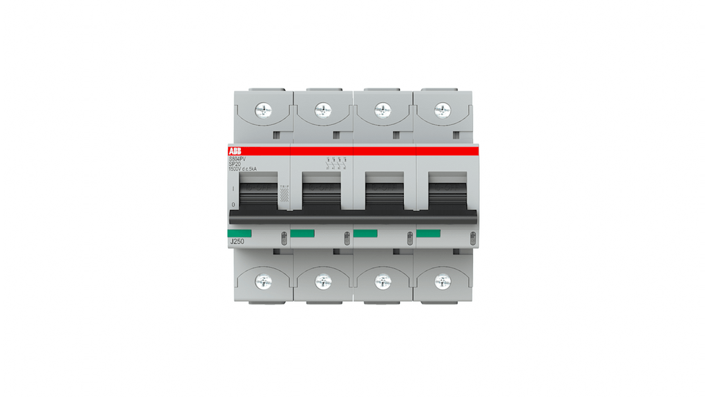 Interruttore magnetotermico a 4 poli, 20A, Tipo B, serie S800PV, montaggio su guida DIN, capacità di interruzione 5kA, tensione massima 1500V c.c., meccanismo di scatto termico e elettromeccanico, grado di protezione IP20, classe di limitazione dell'energia 3, temperatura operativa da -25 a 60 gradi Celsius. Modello S804PV-SP20.
