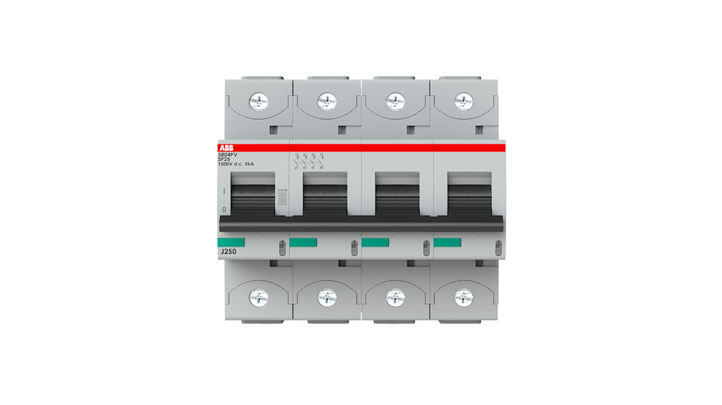 Interruttore magnetotermico a 4 poli, 25A, Tipo B, serie S800PV, montaggio su guida DIN, capacità di interruzione 5kA, tensione massima 1500V c.c., meccanismo di scatto termico e elettromeccanico, grado di protezione IP20, classe di limitazione dell'energia 3, temperatura operativa da -25 a 60 gradi Celsius. Codice costruttore 2CCF019626R0001 S804PV-SP25.