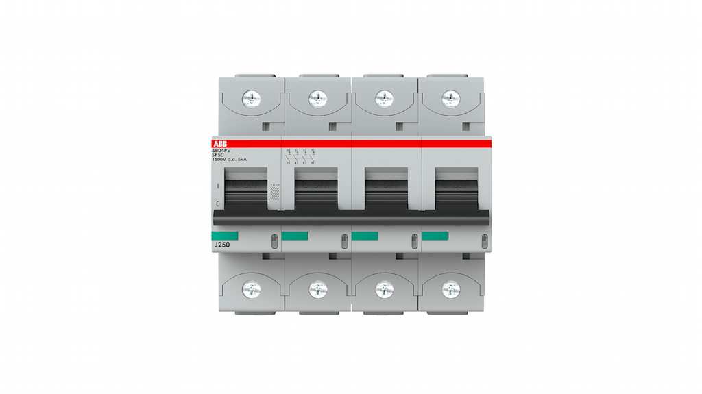 Interruttore magnetotermico a 4 poli, 50A, Tipo B, serie S800PV, montaggio su guida DIN, capacità di interruzione 5kA, tensione massima 1500V c.c., meccanismo di scatto termico e elettromeccanico, grado di protezione IP20, classe di limitazione dell'energia 3, temperatura ambiente da -25 a 60 gradi Celsius. Codice costruttore 2CCF019629R0001 S804PV-SP50.