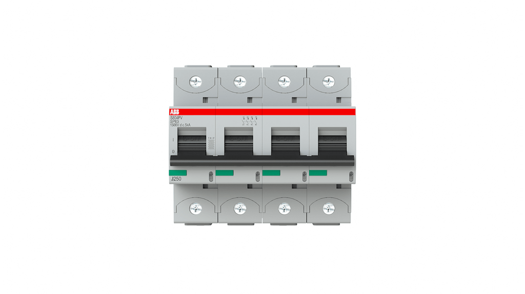 Interruttore magnetotermico a 4 poli, 63A, Tipo B, serie S800PV, montaggio su guida DIN, capacità di interruzione 5kA, tensione massima 1500V c.c., meccanismo di scatto termico e elettromeccanico, grado di protezione IP20, classe di limitazione dell'energia 3, temperatura operativa da -25 a 60 gradi Celsius. Codice costruttore 2CCF019630R0001 S804PV-SP63.