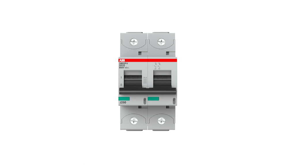 Interruttore magnetotermico a 2 poli, amperaggio 32A, serie S800PV, montaggio su guida DIN, capacità di interruzione massima 1,5 kA, tensione fino a 800V c.c., meccanismo di scatto termico e elettromeccanico, grado di protezione IP20, classe di limitazione dell'energia 3, temperatura operativa da -25 a 60 gradi Celsius. Codice costruttore 2CCF019635R0001 S802PV-SD32.