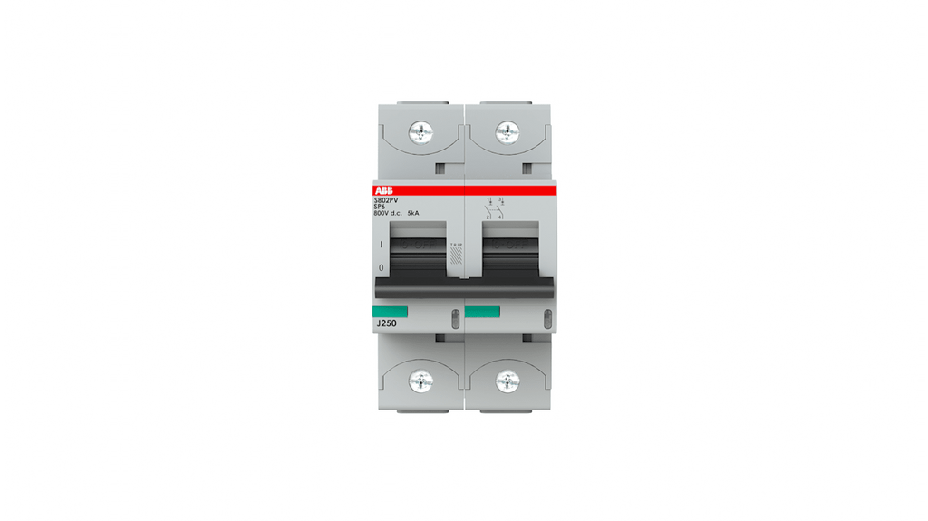 Interruttore magnetotermico a 2 poli, 6A, Tipo B, serie S800PV, montaggio su guida DIN, capacità di interruzione 5 kA, tensione massima 800V c.c., meccanismo di scatto termico per sovraccarichi, meccanismo di scatto elettromeccanico per cortocircuiti, grado di protezione IP20, classe di limitazione dell'energia 3, temperatura ambiente da -25 a 60 gradi.