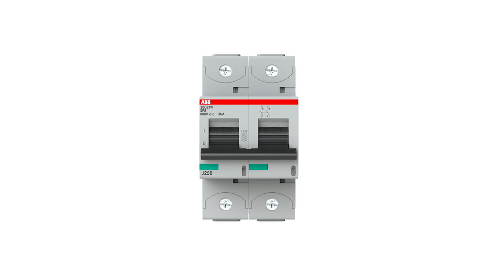 Interruttore magnetotermico a 2 poli, 8A, Tipo B, serie S800PV, montaggio su guida DIN, capacità di interruzione massima 5 kA, tensione fino a 800V c.c., meccanismo di scatto termico per sovraccarichi, meccanismo di scatto elettromeccanico per cortocircuiti, grado di protezione IP20, classe di limitazione dell'energia 3, temperatura ambiente da -25 a 60 gradi.