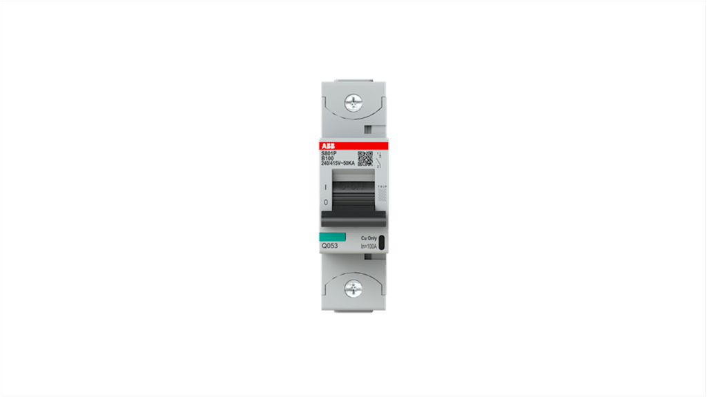 Interruttore magnetotermico ABB 1P 100A 36 kA, Tipo B, modello S800N-B, montaggio su guida DIN, tensione nominale 400-690 V, capacità di rottura 36 kA, temperatura d'esercizio -25 a 60 gradi Celsius, larghezza 27 mm, conforme a EN 60898-1 e IEC 60947-2, progettato per circuiti con picchi di bassa corrente, dotato di indicatore di posizione di intervento e accessori vari.