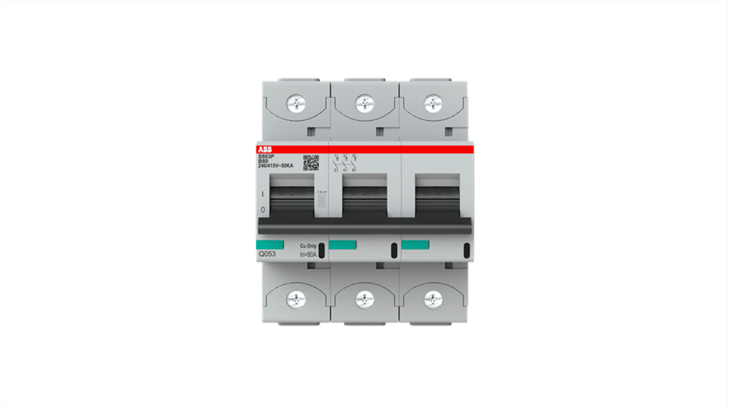 Interruttore magnetotermico tripolare, 80A, Tipo B, serie S800, capacità di interruzione 50 kA, tensione nominale 400-690 V c.a., 250 V c.c., montaggio su guida DIN, temperatura d'esercizio da -25 a +60 gradi, larghezza 79,5 mm, profondità 88,5 mm, conforme a EN 60898-1, IEC 60947-2, UL489, certificato CCC, GOST-R, LR, DNV, RINA.