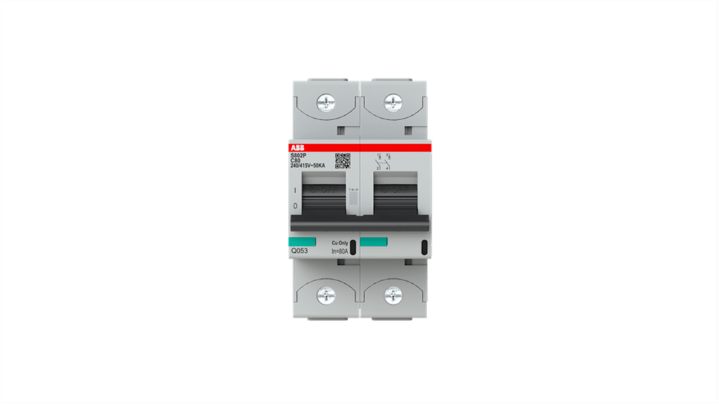 Interruttore magnetotermico a 2 poli, 80A, Tipo C, serie S800 ABB, capacità di interruzione massima 25kA, meccanismo di scatto termico e elettromeccanico, grado di protezione IP20, temperatura d'esercizio da -25 a 60 gradi Celsius, classe di limitazione dell'energia 3, montaggio su guida DIN, certificato IEC60947-2, EN45545, IEC61373. Codice costruttore 2CCG001229R0001.
