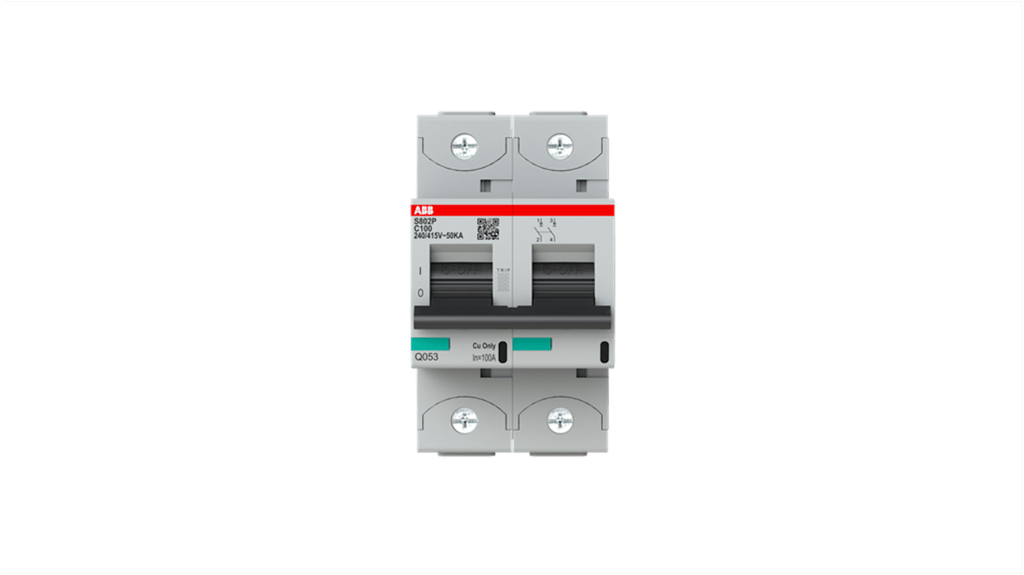 Interruttore magnetotermico bipolare, 100A, Tipo C, serie S800, capacità di interruzione 50 kA, tensione nominale 400-690 V c.a., 250 V c.c., montaggio su guida DIN, temperatura d'esercizio da -25 a +60°C, dimensioni 53 mm di larghezza, 95 mm di lunghezza, 88.5 mm di profondità, conforme a EN 60898-1, IEC 60947-2, UL489, certificato CCC, GOST-R, LR, DNV, RINA.