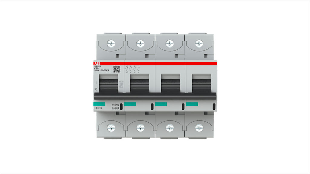 Interruttore magnetotermico a 4 poli, 80A, Tipo C, serie S800 ABB, prestazioni elevate, capacità di interruzione massima 25kA, meccanismo di scatto termico e elettromeccanico, grado di protezione IP20, temperatura d'esercizio da -25 a 60 gradi Celsius, montaggio su guida DIN, certificato IEC60947-2, EN45545 per fuoco e fumo, IEC61373 per vibrazioni e urti. Codice costruttore 2CCG001235R0001.