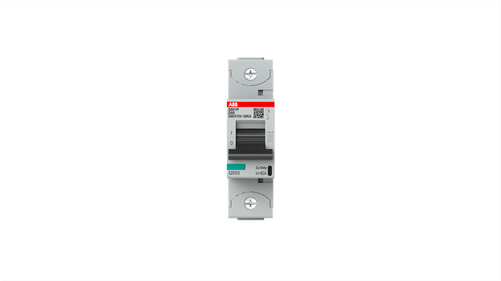 Interruttore magnetotermico unipolare ABB 80A, Tipo D, capacità di rottura 50 kA, tensione nominale 400-690 V c.a., 250 V c.c., montaggio su guida DIN, serie S800, prestazioni elevate, dimensioni 27 mm di larghezza, 88.5 mm di profondità, temperatura d'esercizio -25 a 60 °C, conforme a standard EN 60898-1, IEC 60947-2, UL489. Codice costruttore 2CCG001238R0001.