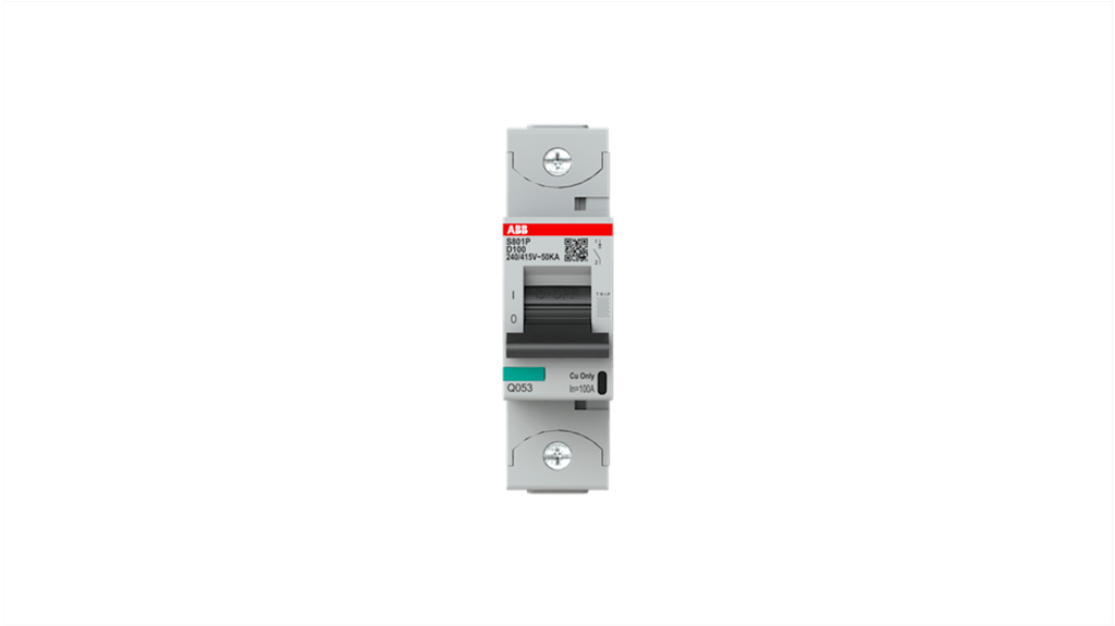 Interruttore magnetotermico ABB 1P 100A 36 kA, Tipo D, MCB ad alte prestazioni S800N-D, tensione nominale 400-690 V, capacità di rottura 36 kA, montaggio su guida DIN, temperatura d'esercizio -25 a 60 gradi Celsius, larghezza 27 mm, lunghezza 95 mm, profondità 88.5 mm, conforme a EN 60898-1 e IEC 60947-2. Adatto per circuiti con carichi di picco elevati.