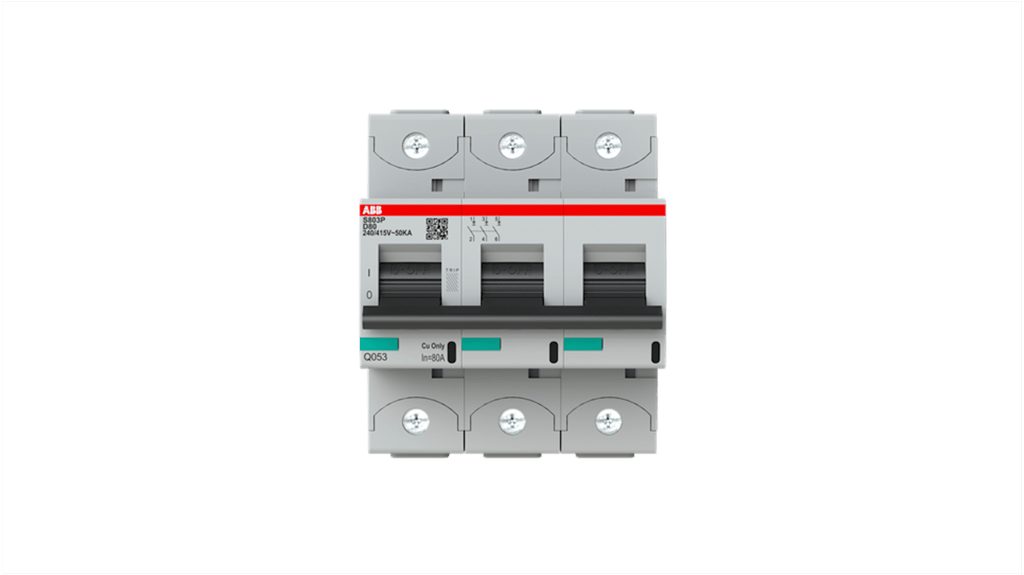 Interruttore magnetotermico tripolare, 80A, Tipo D, capacità di interruzione 50 kA, serie S800. Montaggio su guida DIN, tensione nominale 400-690 V c.a., temperatura d'esercizio da -25 a +60 gradi Celsius. Dimensioni: larghezza 79,5 mm, profondità 88,5 mm. Conforme a EN 60898-1, IEC 60947-2, UL489. Certificato CCC, GOST-R, LR, DNV, RINA.
