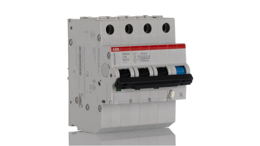 Interruttore differenziale RCCB, 4 poli, corrente nominale 16 A, sensibilità di intervento 100 mA, caratteristica di intervento Tipo C, tensione nominale 415 V CA, montaggio su guida DIN, capacità di cortocircuito 10 kA, dimensioni 91 x 72 x 91 mm, design a innesto, standard IEC. Marchio ABB, codice costruttore 2CCL564120E0164 FS403 M-C16/0.1 RCBO.