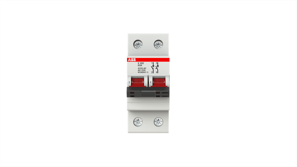 Isolatore per carico di comando, tensione nominale 230 V c.a. e 400 V c.a., perdita di potenza 3,3 W, smontaggio rapido senza rimozione della barra di distribuzione, viti prigioniere con testa incassata/scanalata, compatibile con la serie E202 di ABB. Codice costruttore 2CDE282001R0063 E202/63r.